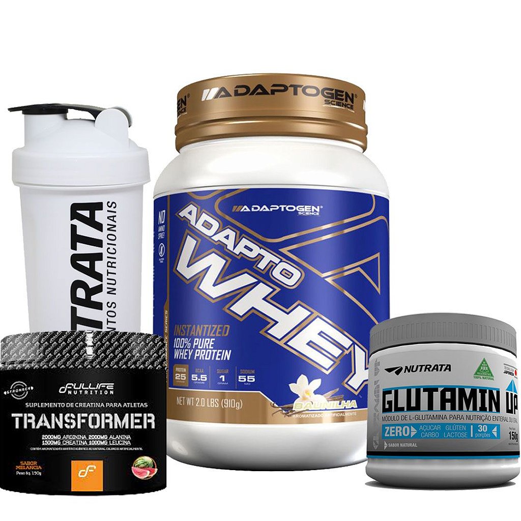 Combo ideal para quem busca ganho de massa muscular, adapto whey contém 25 gr de proteína com 2,5 gr de carboidrato somente. Transformer 150 gr contém 2.000 mg de arginina, 2.000 mg de arginina e baixo carbo e glutamina para aumento de imunidade e recuperação muscular.