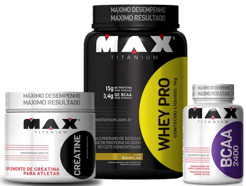 COMBO WHEY PRO 1 KG - MAX TITANIUM - ( whey pro 1kg max titanium, bcaa 100 cápsulas max titanium, C. 100 gramas max titanium)