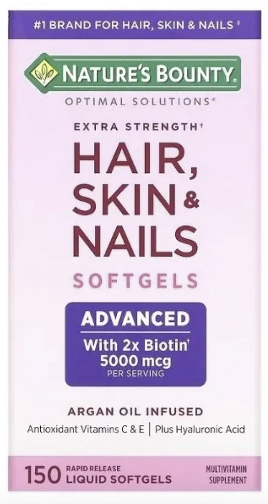 A fórmula Nature's Bounty® Optimal Solutions® Hair, Skin & Nails contém nutrientes balanceados para ajudar você a continuar com a melhor aparência e a se sentir melhor.* Os ingredientes incluem biotina , que ajuda manter cabelos bonitos, pele vibrante e unhas saudáveis além de ácido hialurônico e vitaminas A, C E. * Contém 150 cápsulas gelatinosas líquidas de liberação rápida .